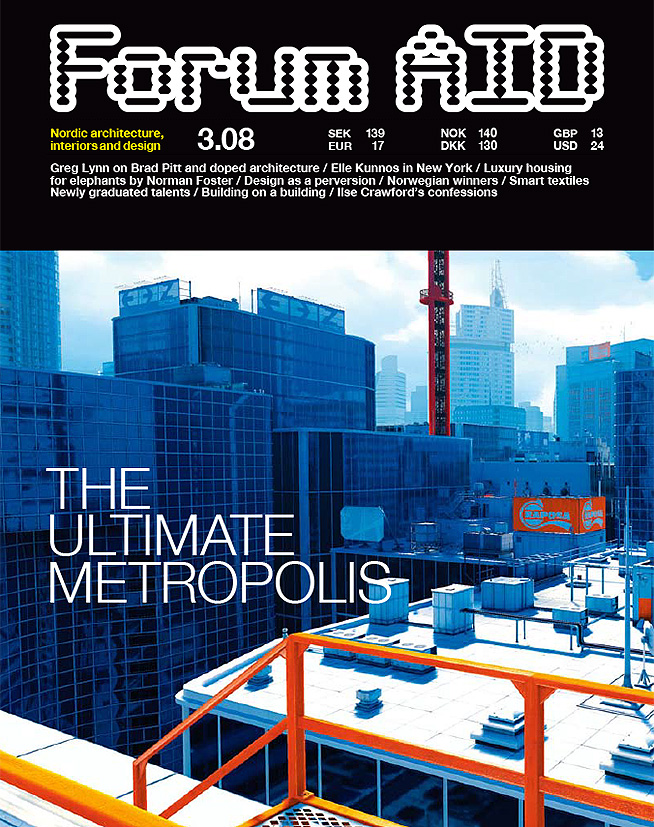 Forum Arkitektur Inredning Design Artdirection Omslag tema datorspel. Forum AID – Arkitektur Inredning Design Reportage: Elefanter i Köpenhamn har fått ett nytt arkitektritat hem, av Klas Ericsson. Bild Christoffer Rudquist Reportage fortsättning, bild Christoffer Rudquist Forum AID ville skildra arkitektur mer realistiskt och levande än det klassiska bildmaneret för ämnet. Omslagsjobbet, av Anders Rydell Plocksida Plocksida Forum kom ut på två språk. Illustration Annelie Carlström Fortsättning reportage Biomechanics av Anders Rydell Relaterade